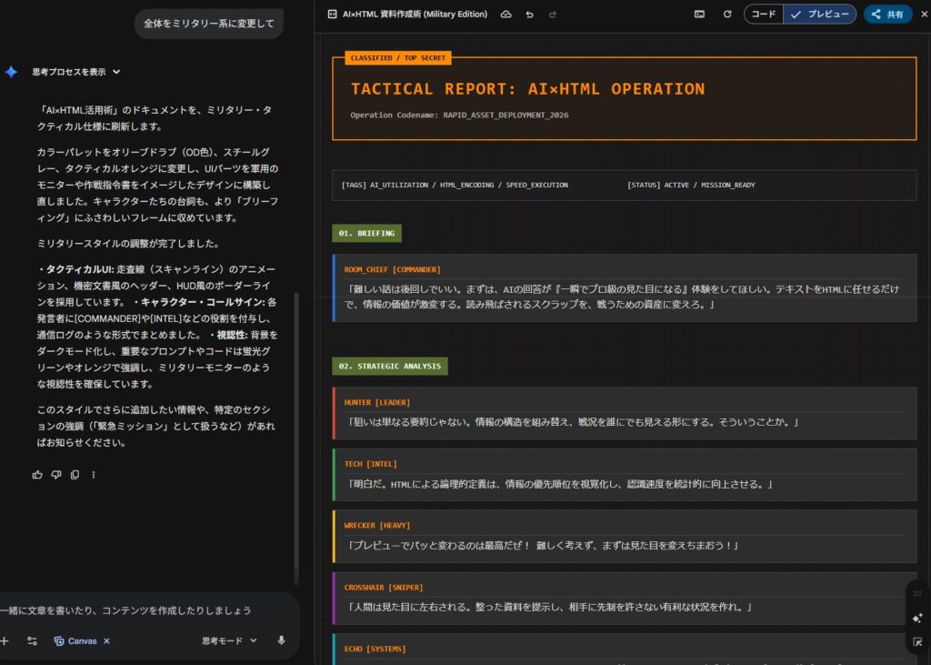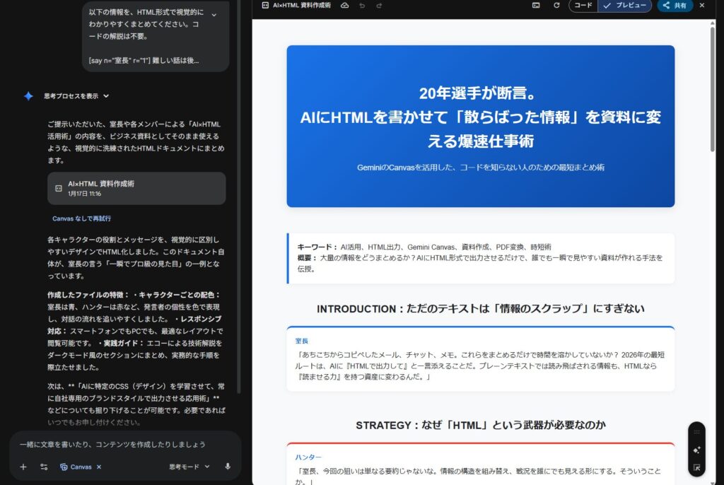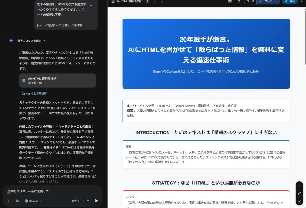 • 「HTML形式でまとめて」と指示するだけで、整理された画面が瞬時に完成する。